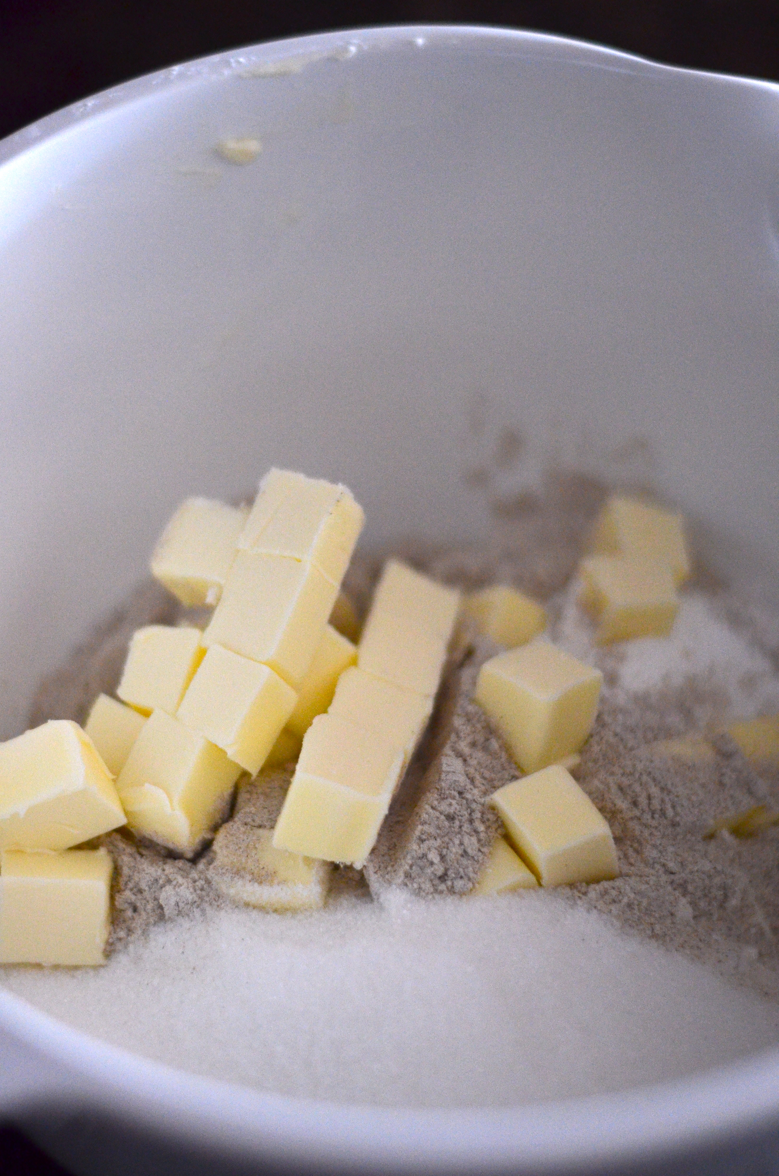 Add cut butter into flour mixture and use a fork or fingers to break the butter into the flour, moving quickly so butter stays cold. Continue until butter is in coarse, pea-sized pieces.