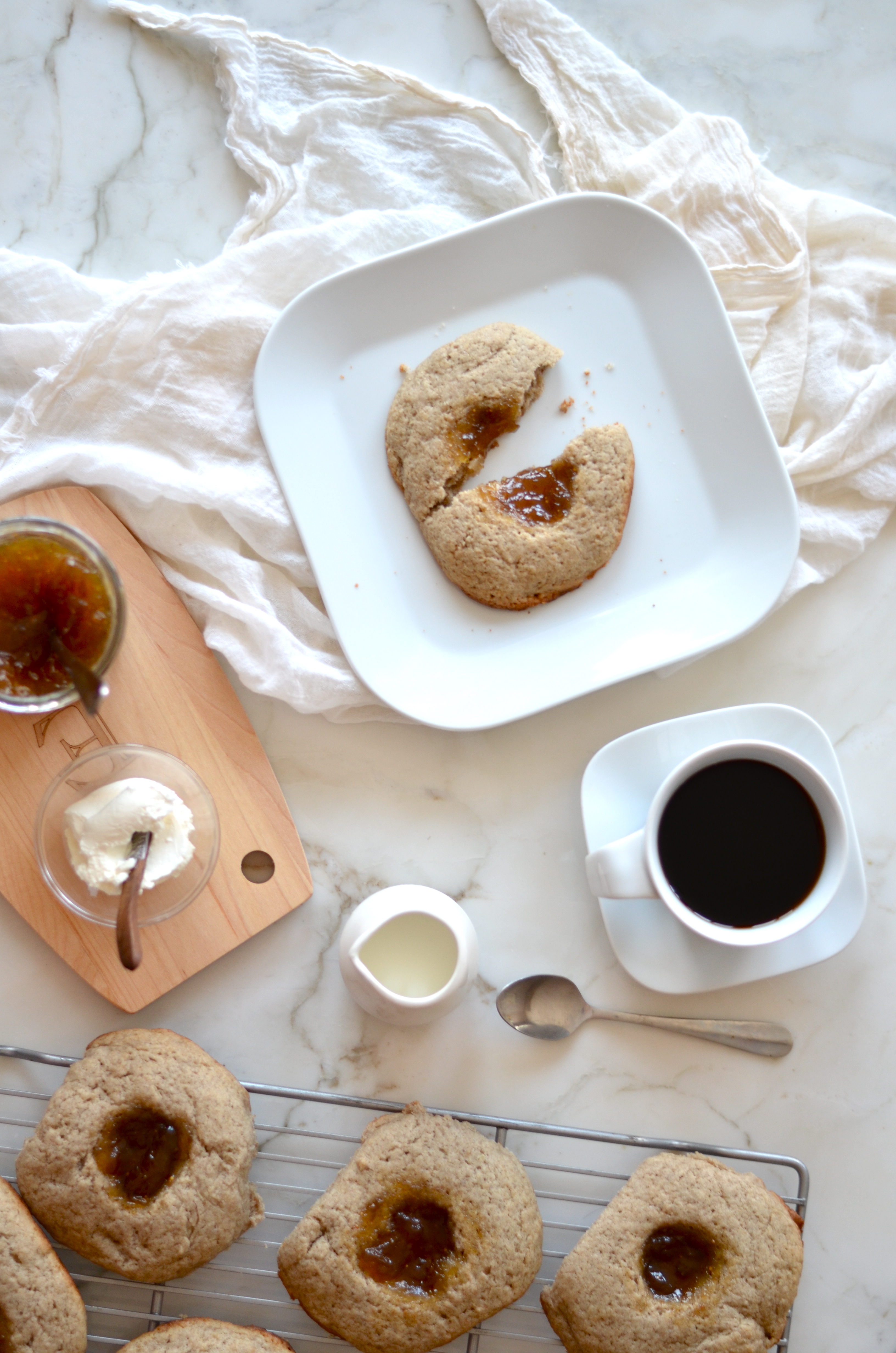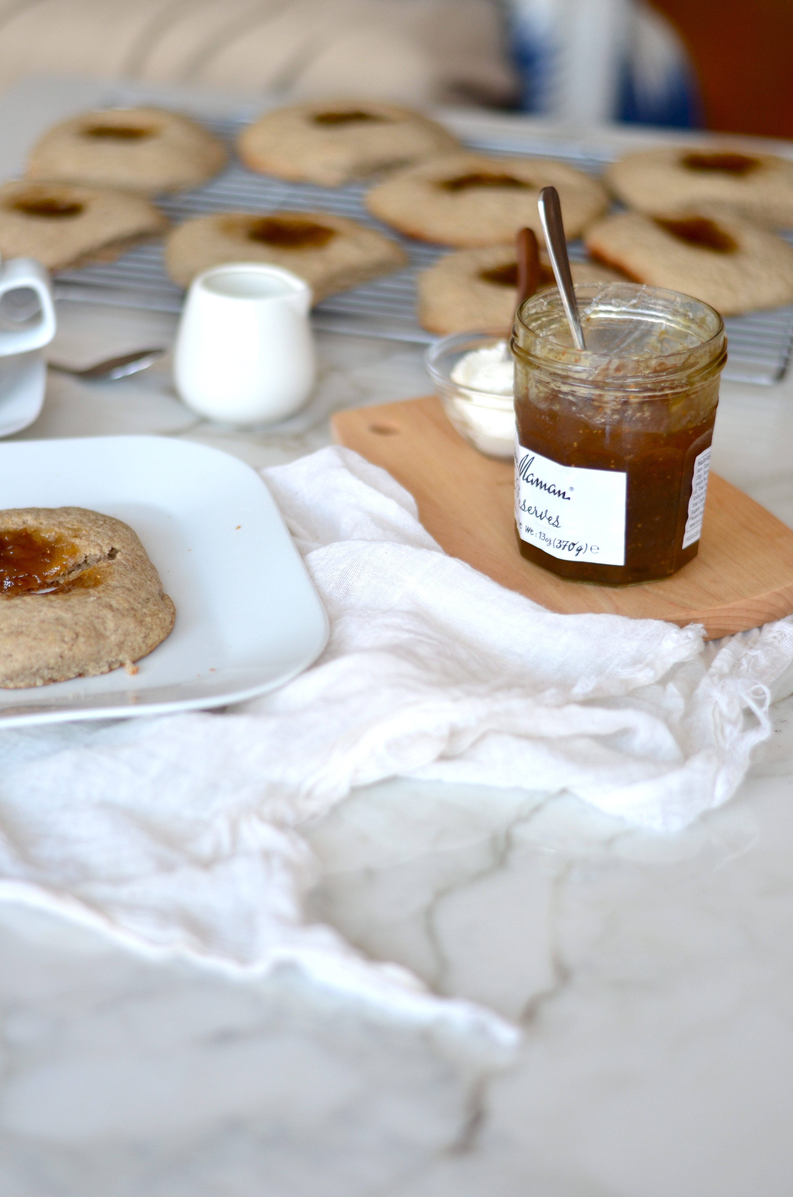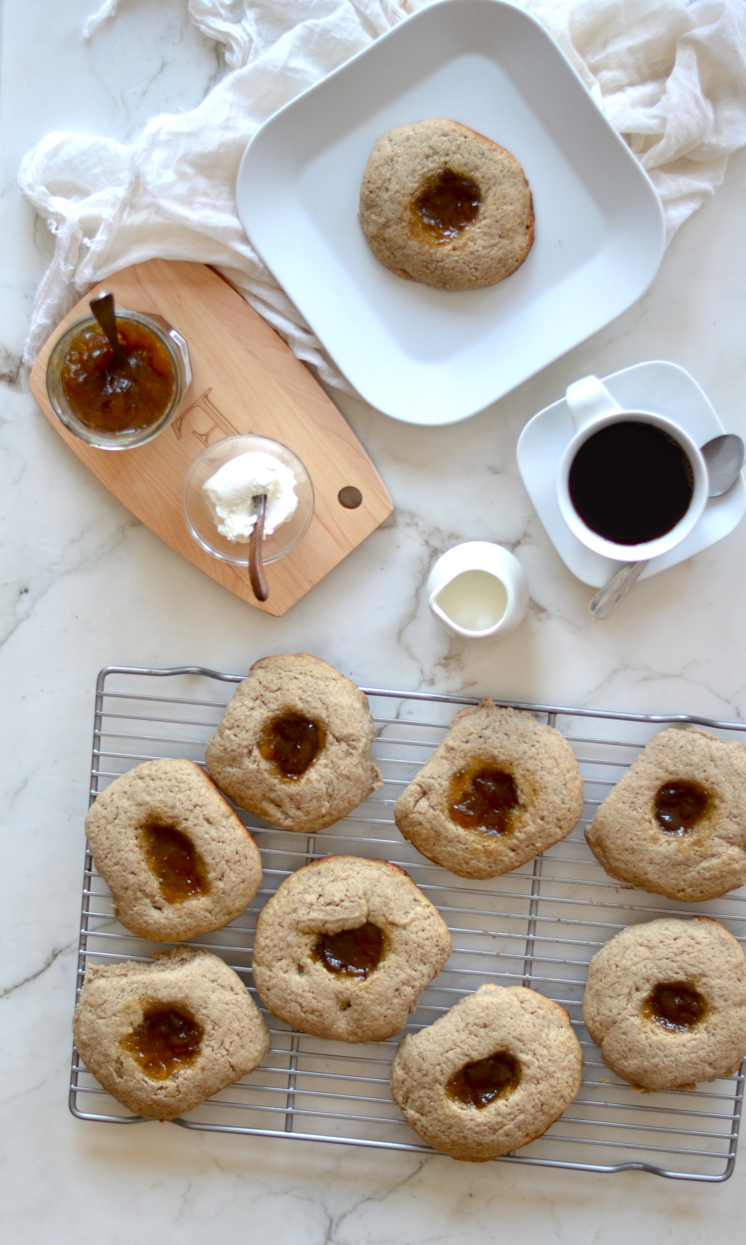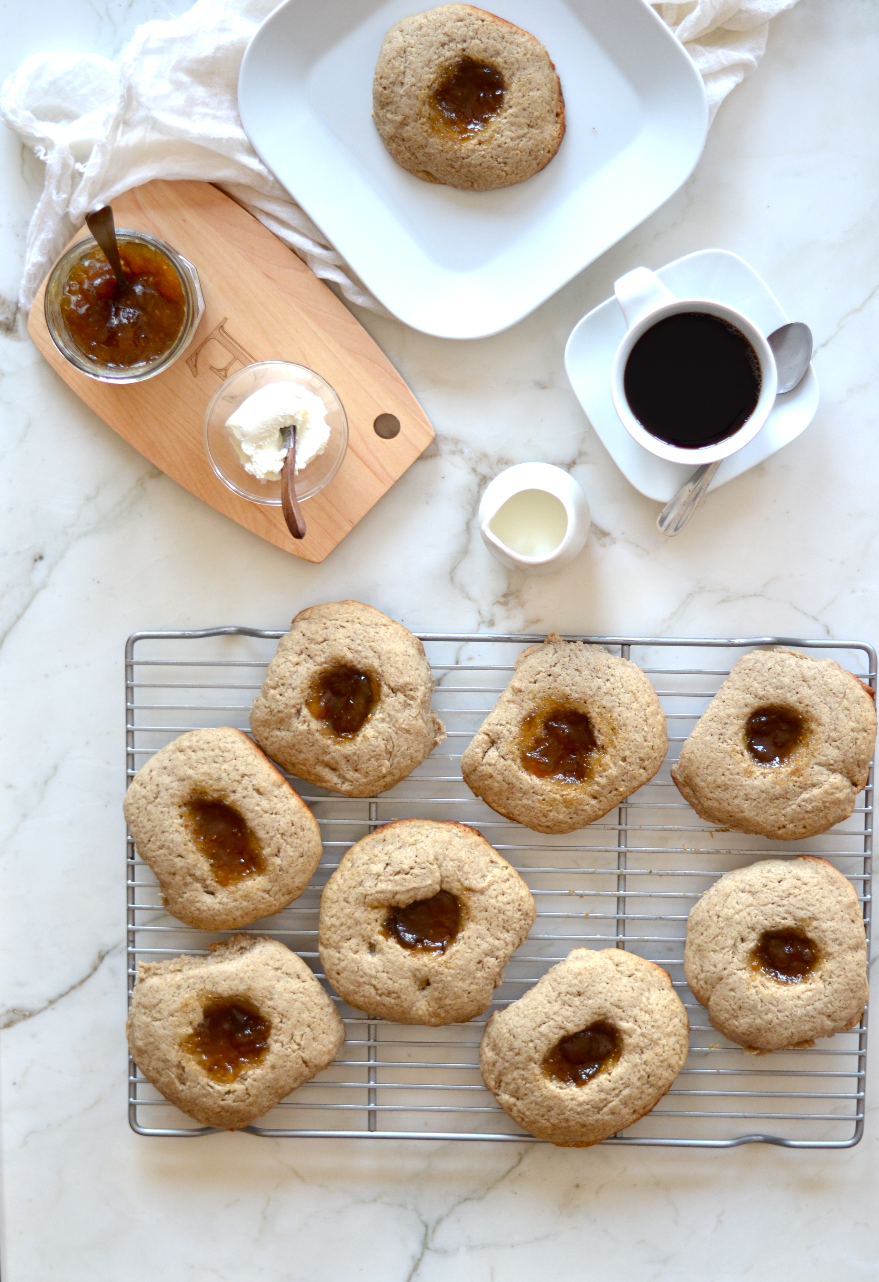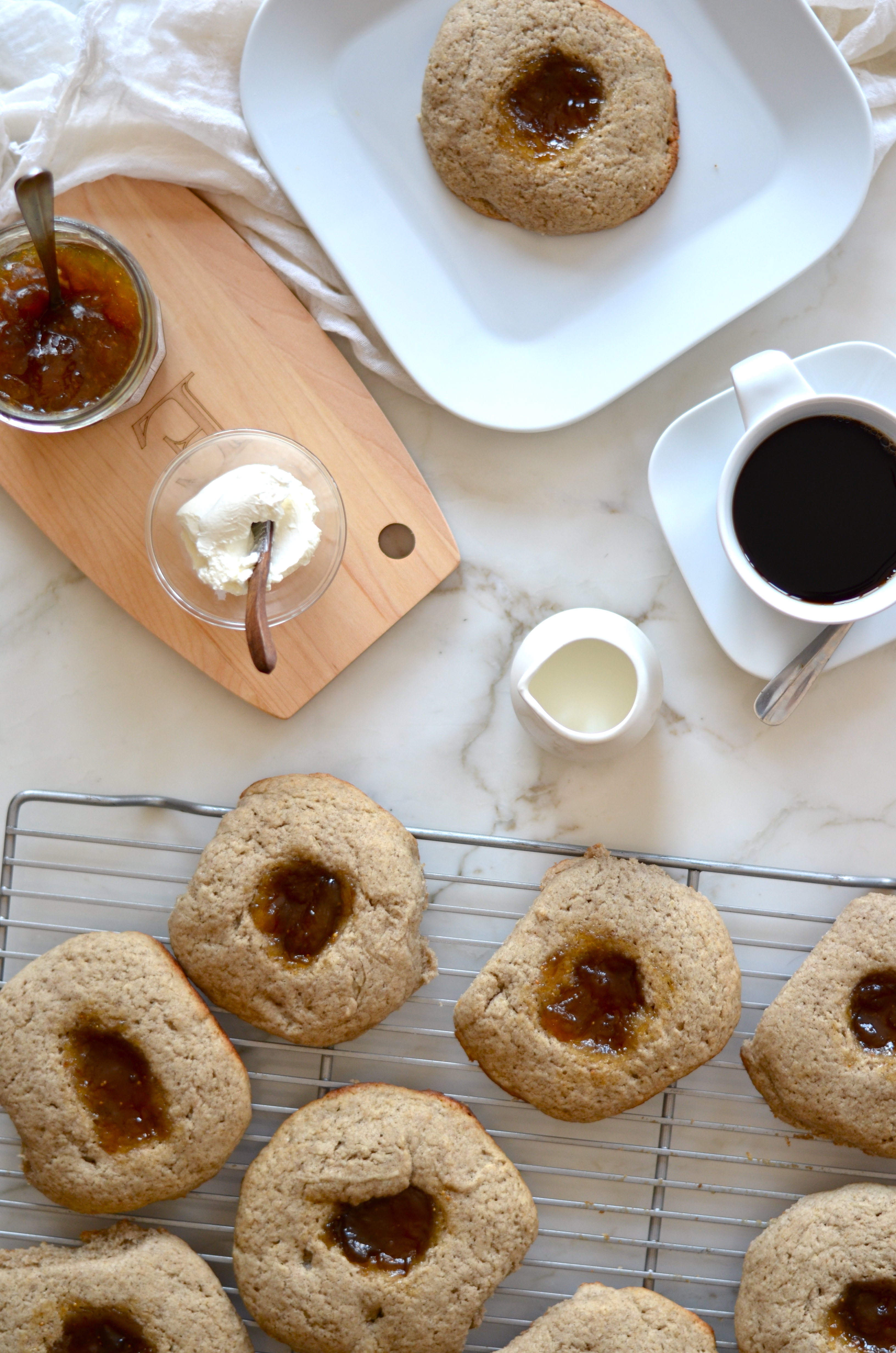 Preheat oven to 350. Once scones have chilled, remove from oven and use a teaspoon or tablespoon to press an indentation into the dough. Fill will jam and place into the oven for 35-40 minutes, or until the bottom/sides begin to brown. Remove from oven and let cool.