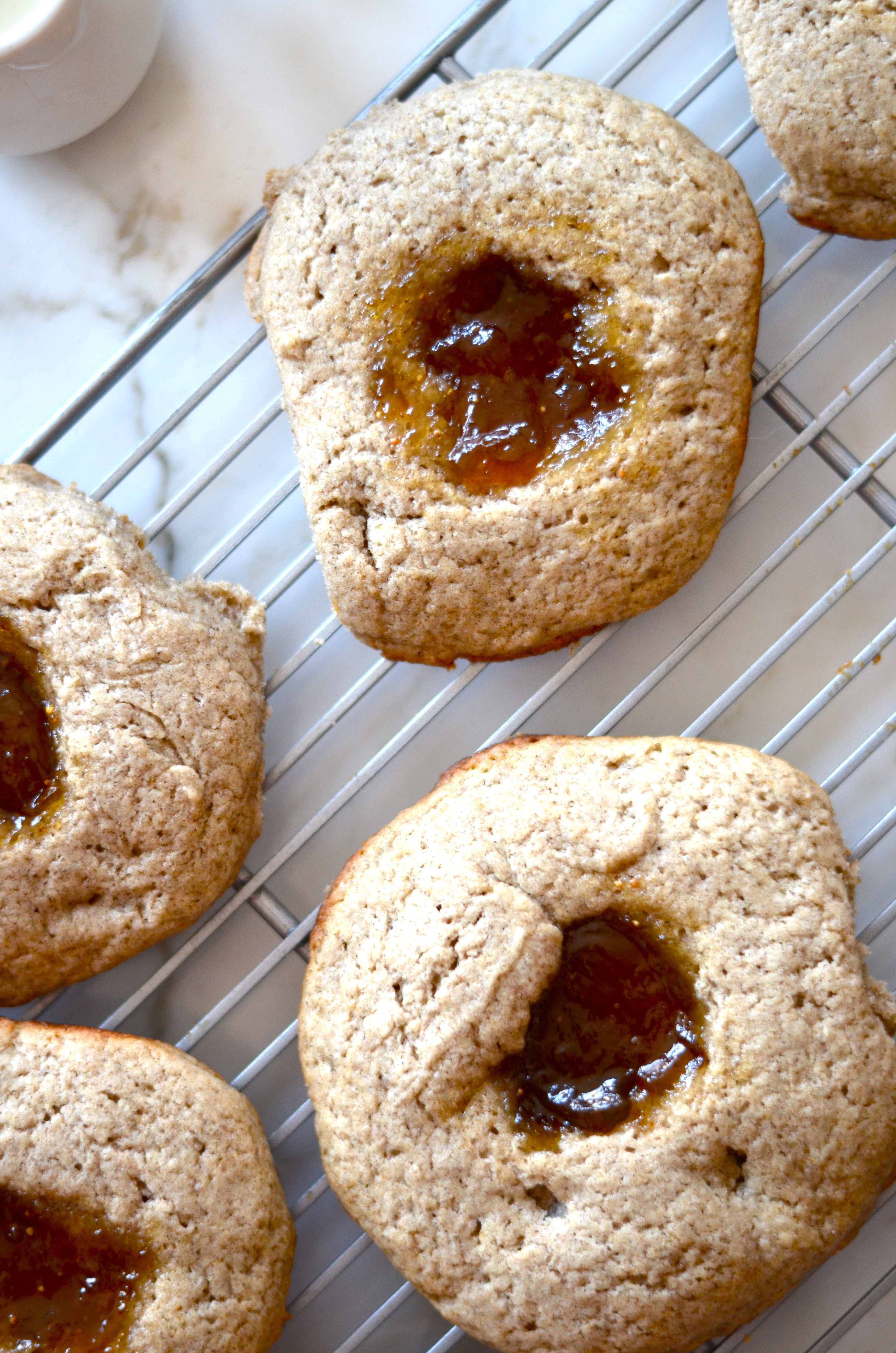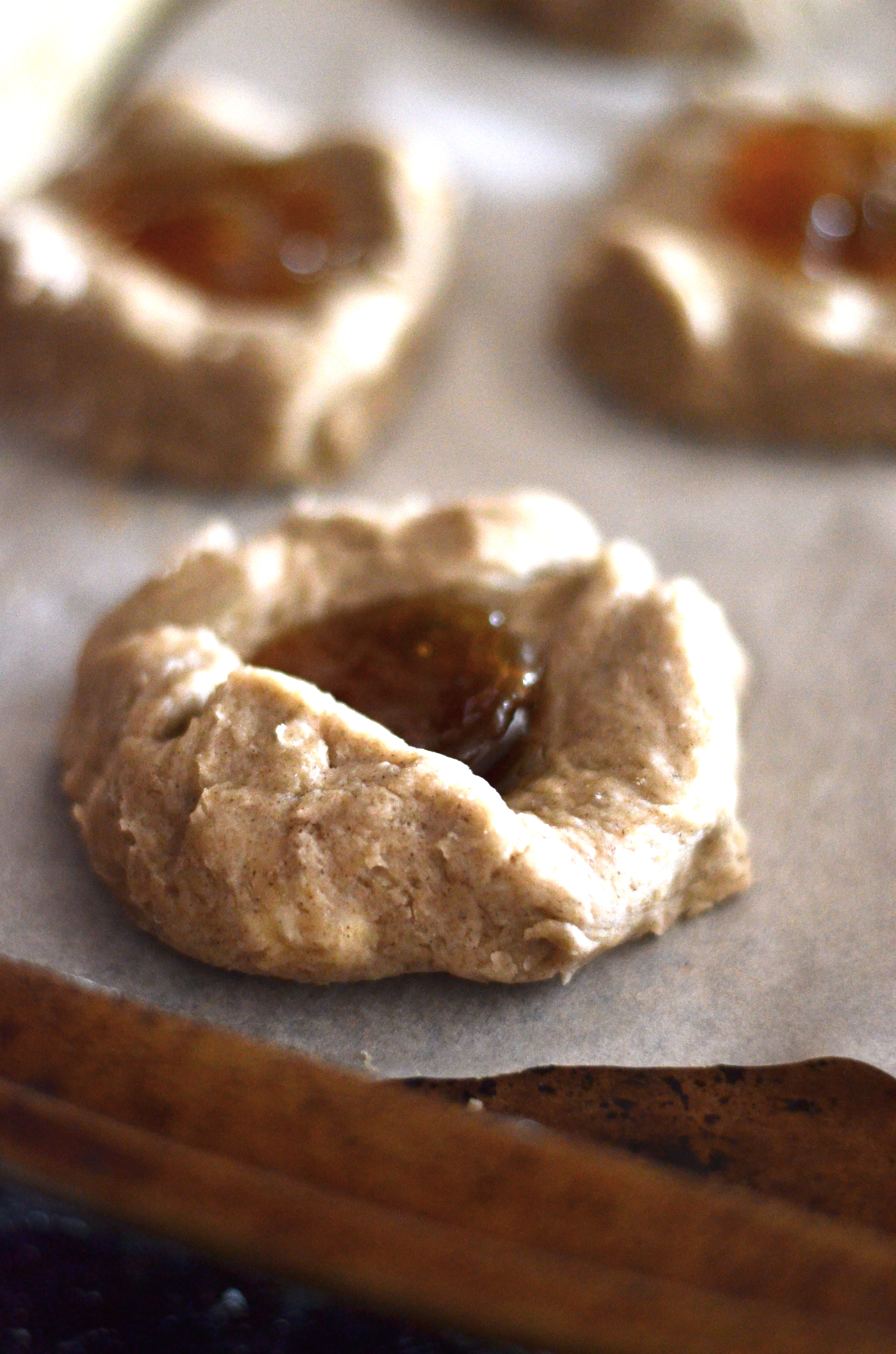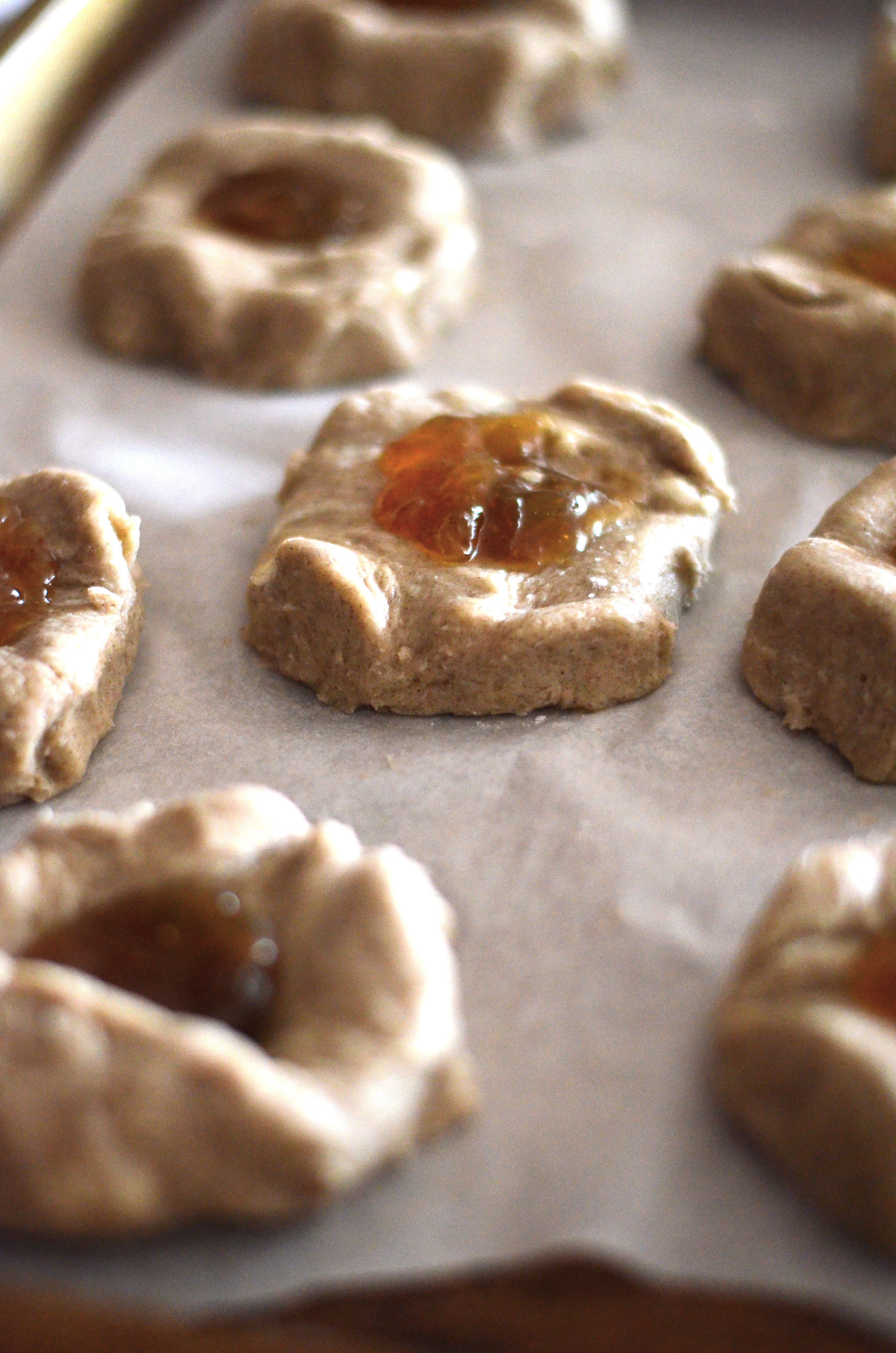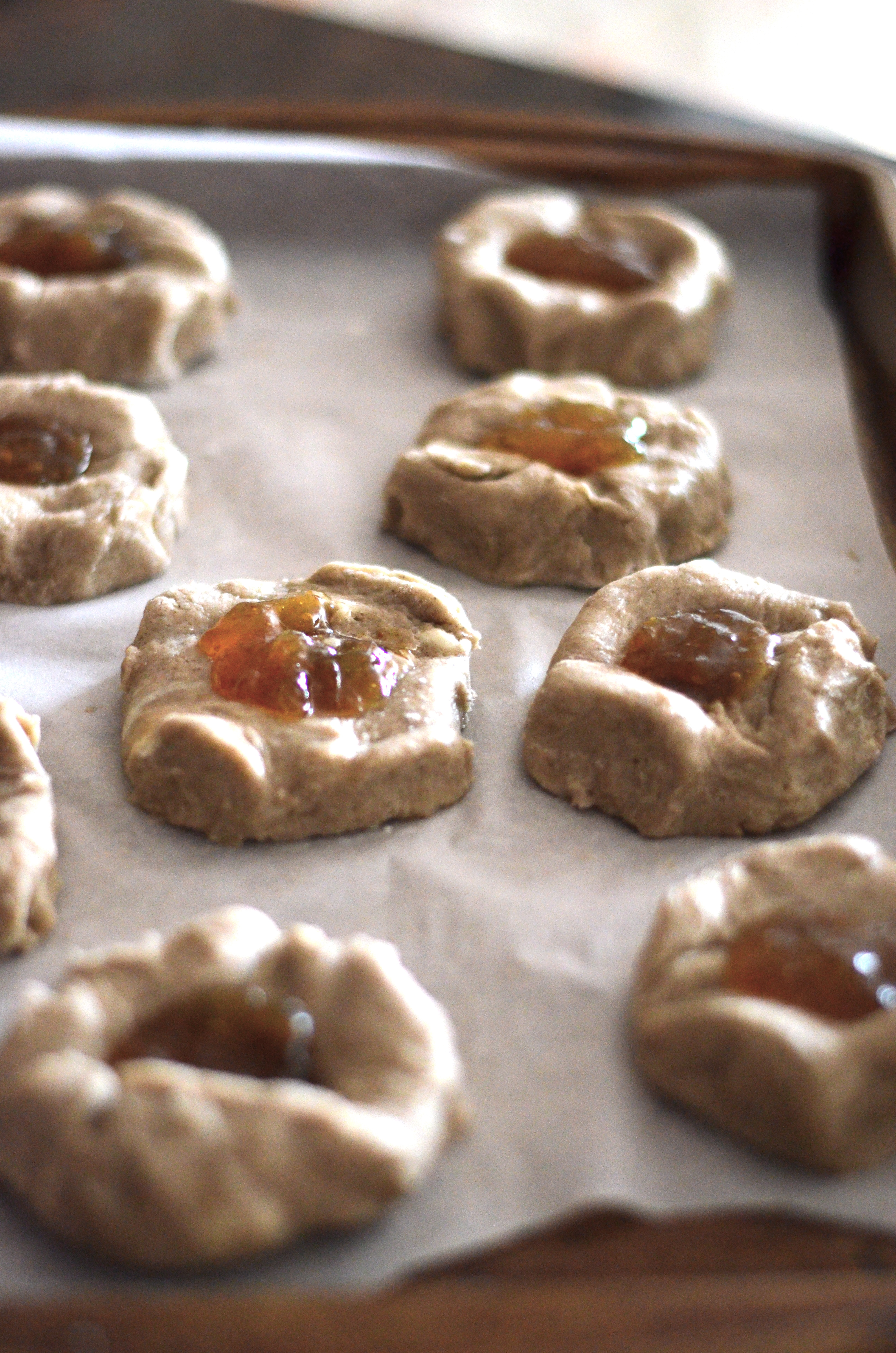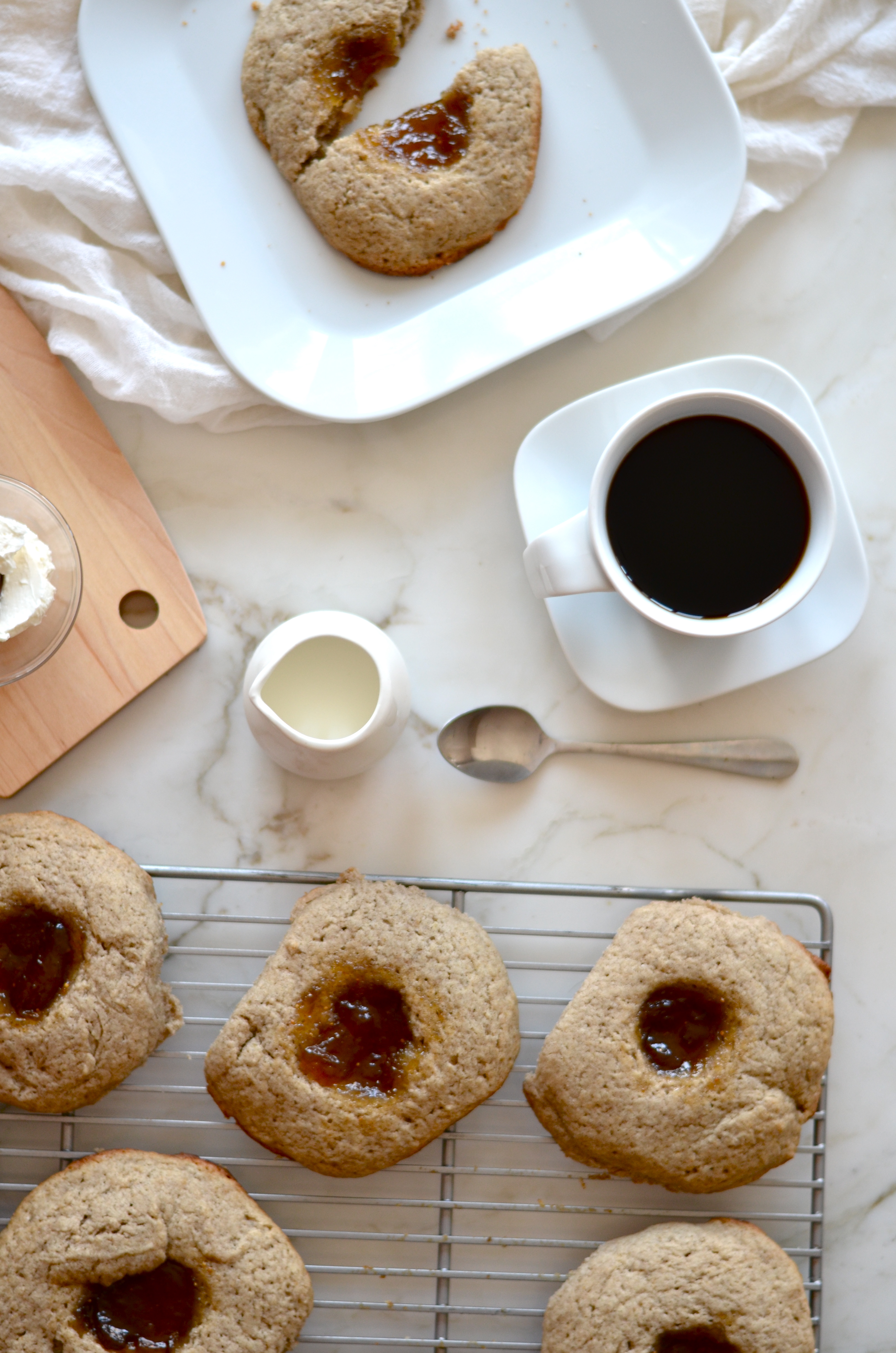 Preheat oven to 350. Once scones have chilled, remove from oven and use a teaspoon or tablespoon to press an indentation into the dough. Fill will jam and place into the oven for 35-40 minutes, or until the bottom/sides begin to brown. Remove from oven and let cool.