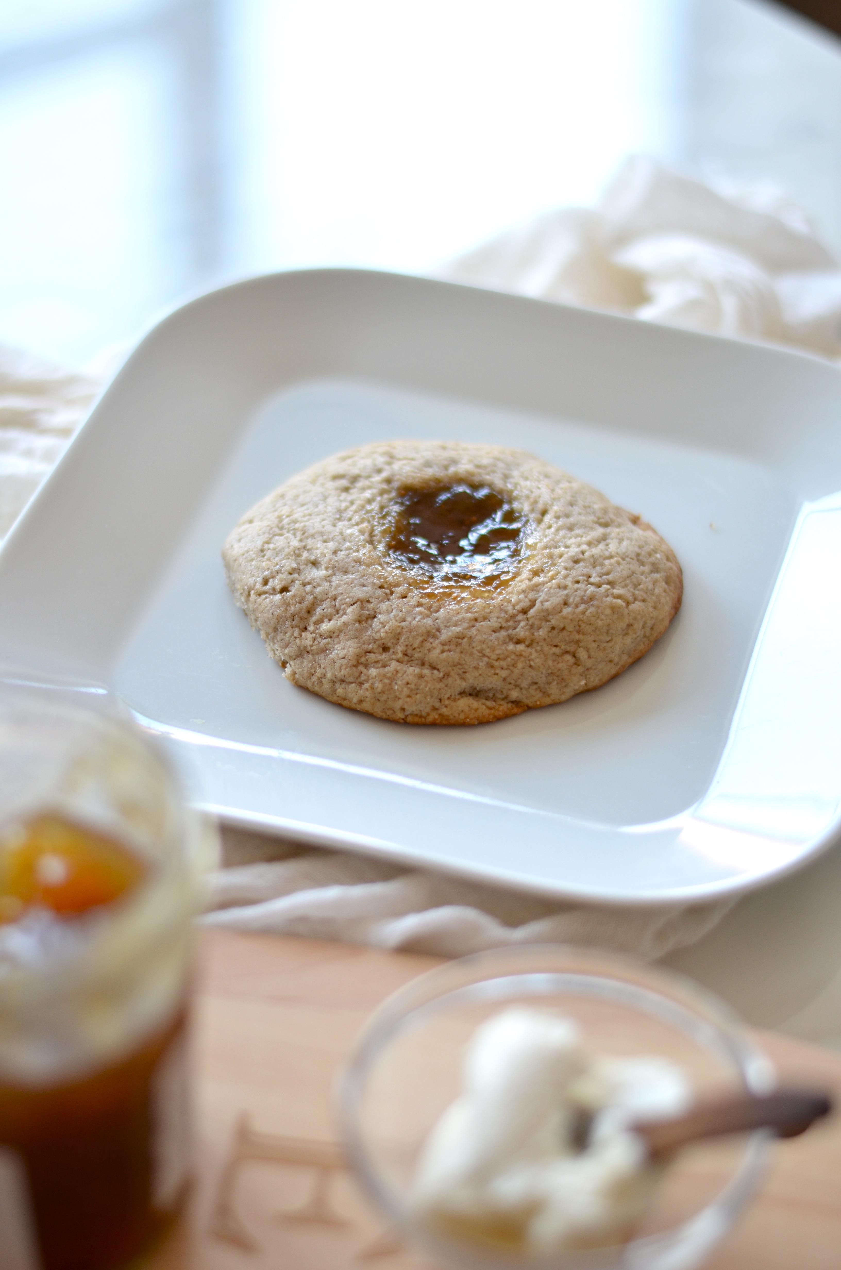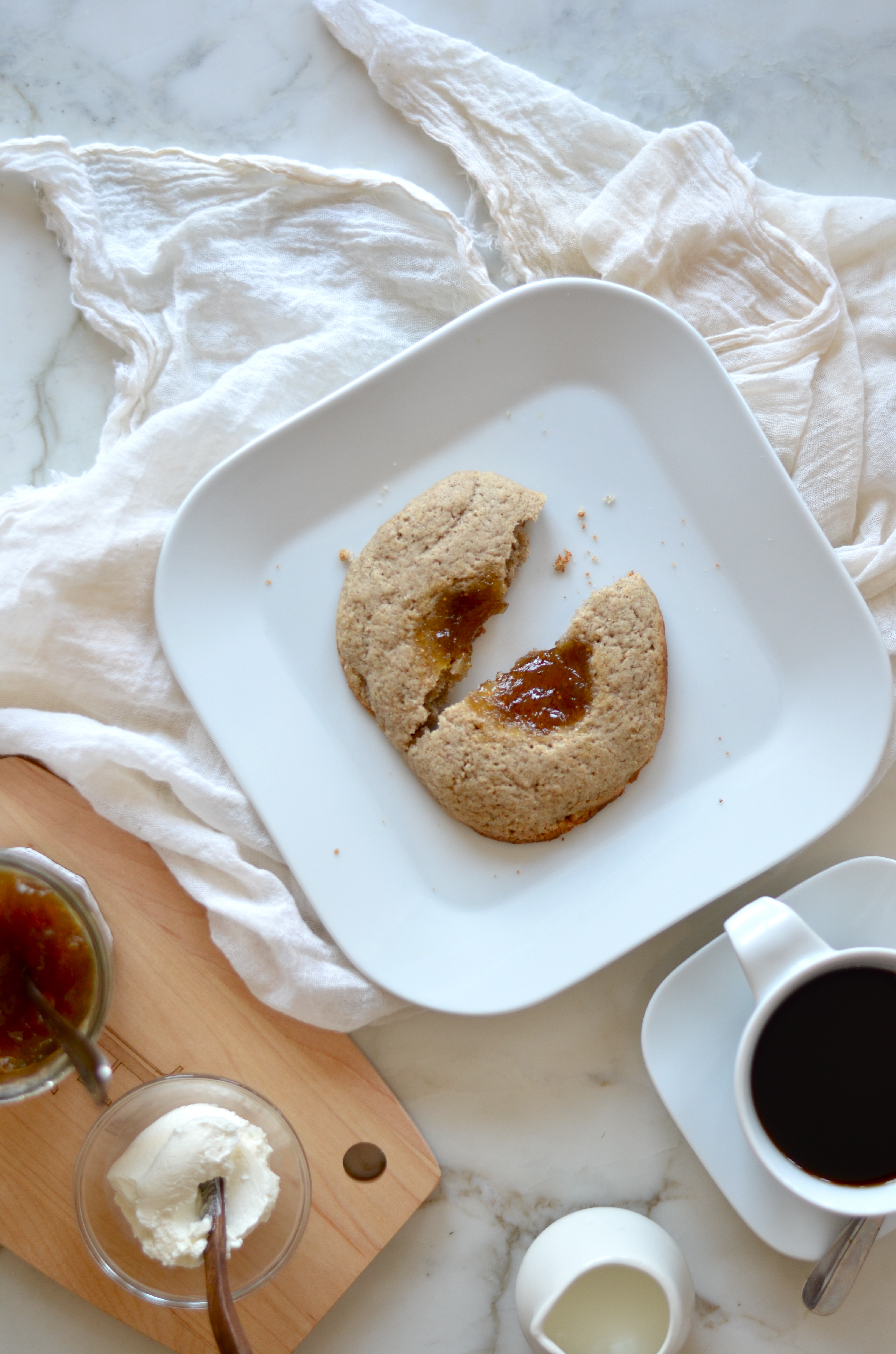 Optional additions: Brush scones with an egg white and sprinkle with coarse sugar for a pretty decoration/added sweetness. Can sub any flavor jam of choice!