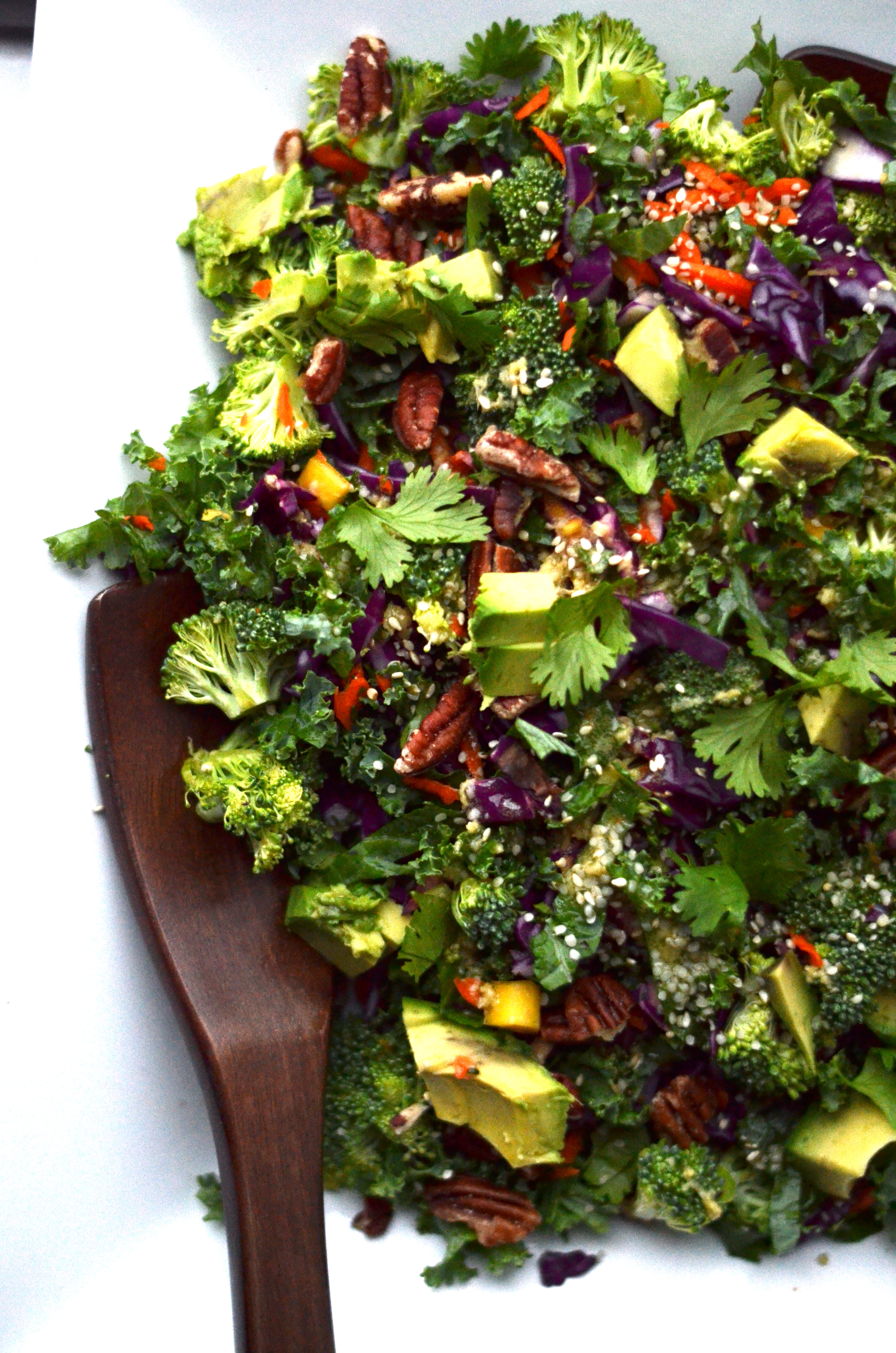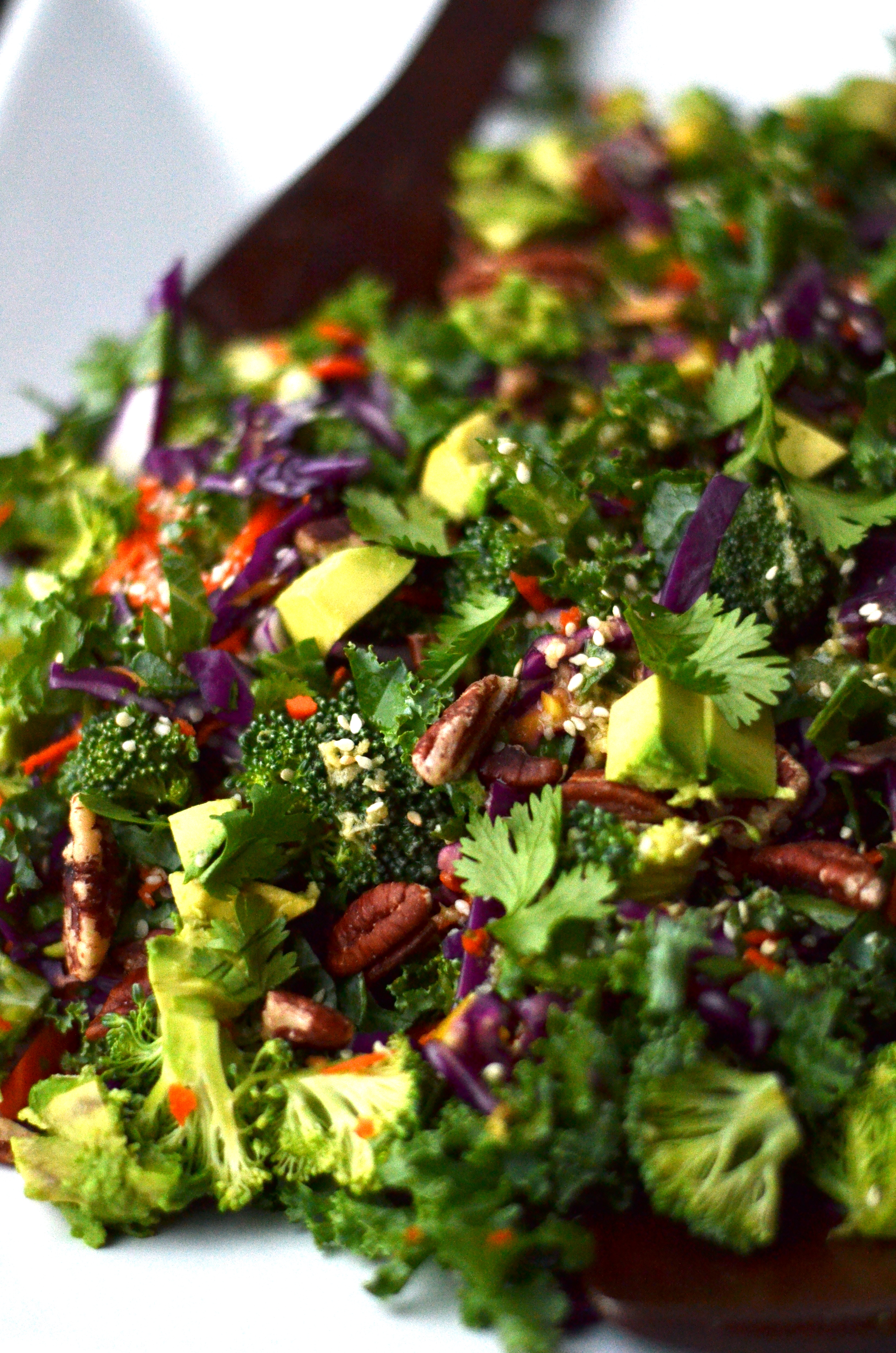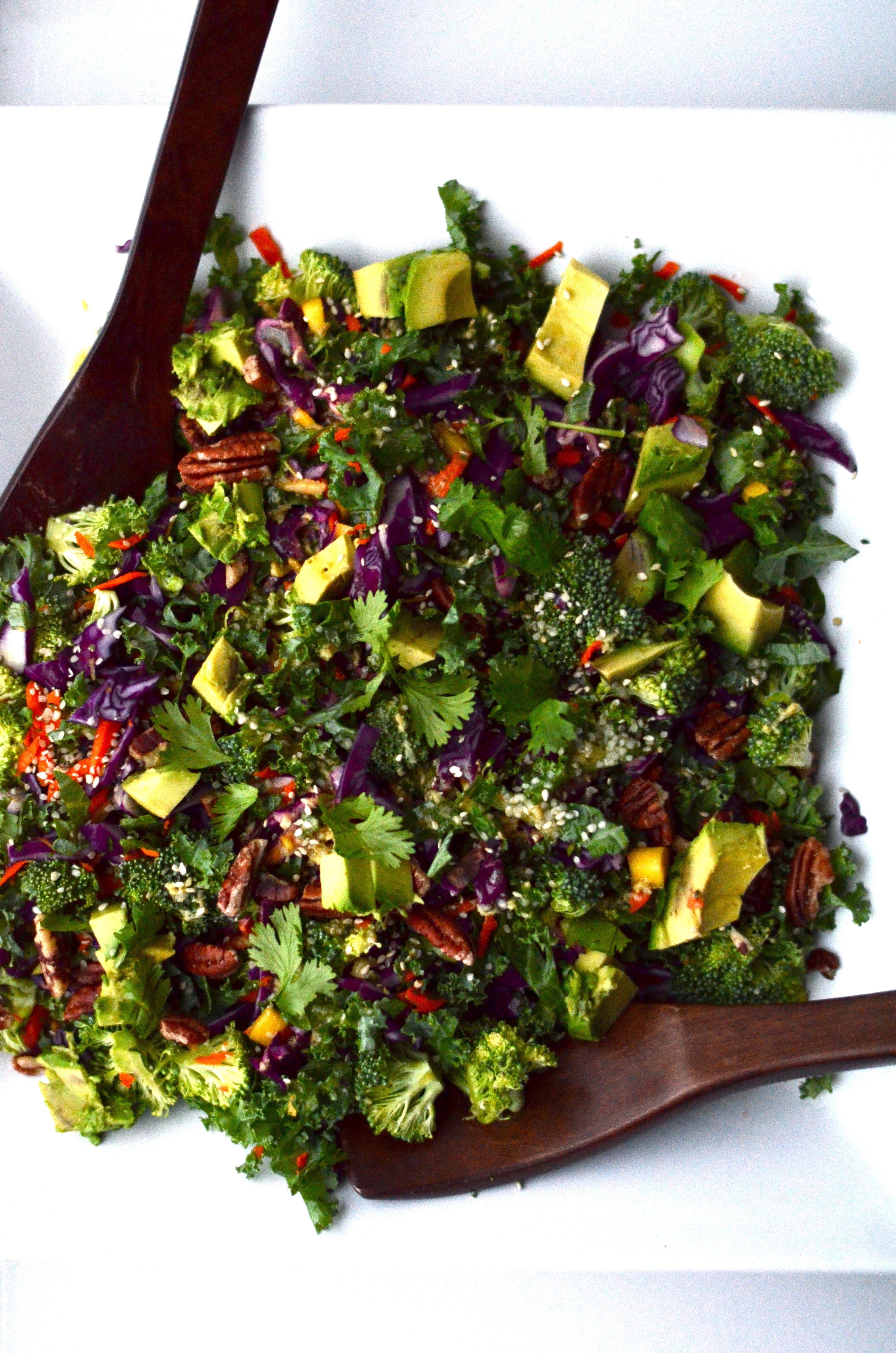 Thinly slice and dice up all your veggies. Toss everything together and make dressing by combining all ingredients listed. Whisk lightly and then pour over salad. Top with a sprinkling of sesame seeds or hemp seeds!