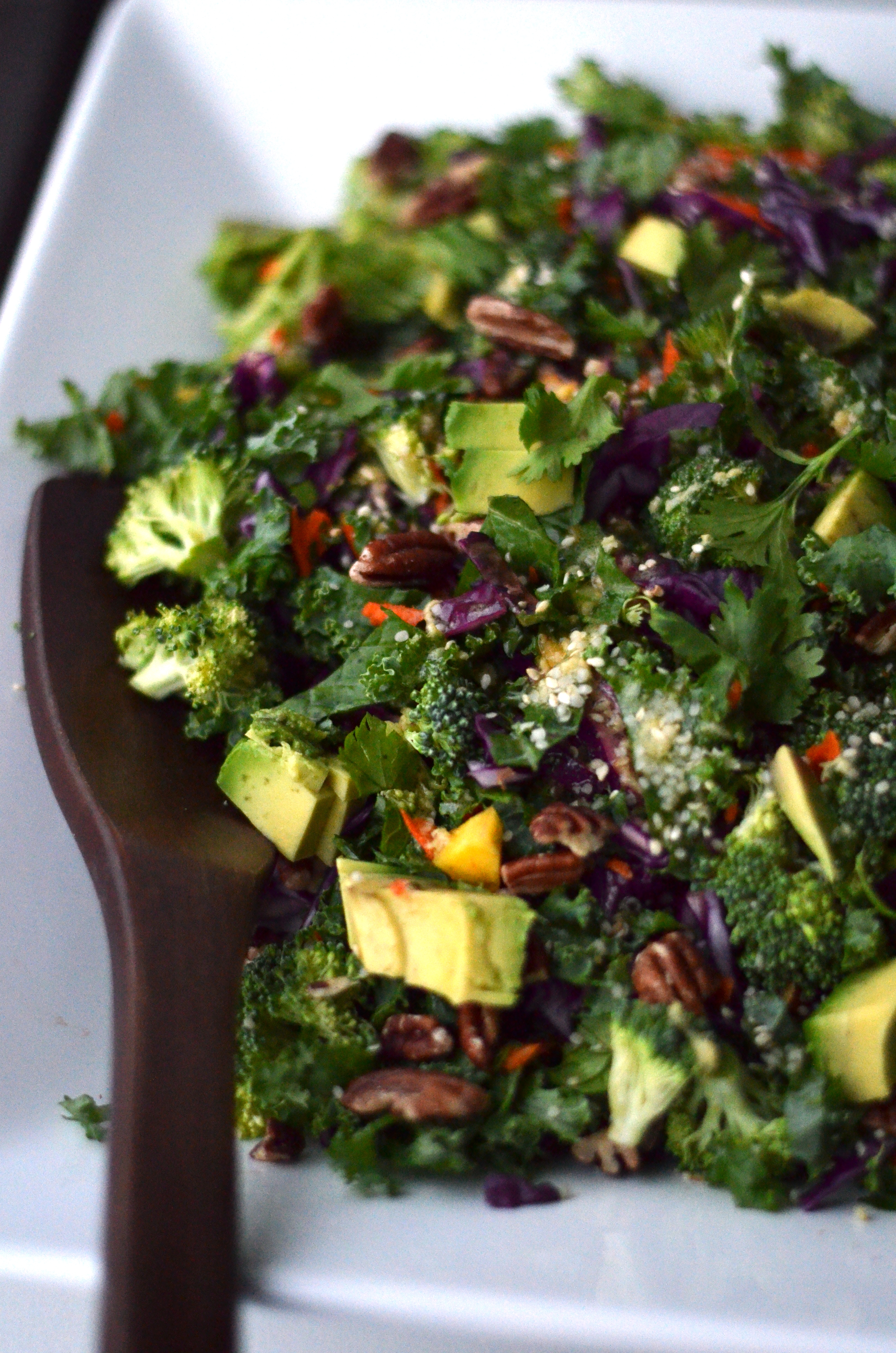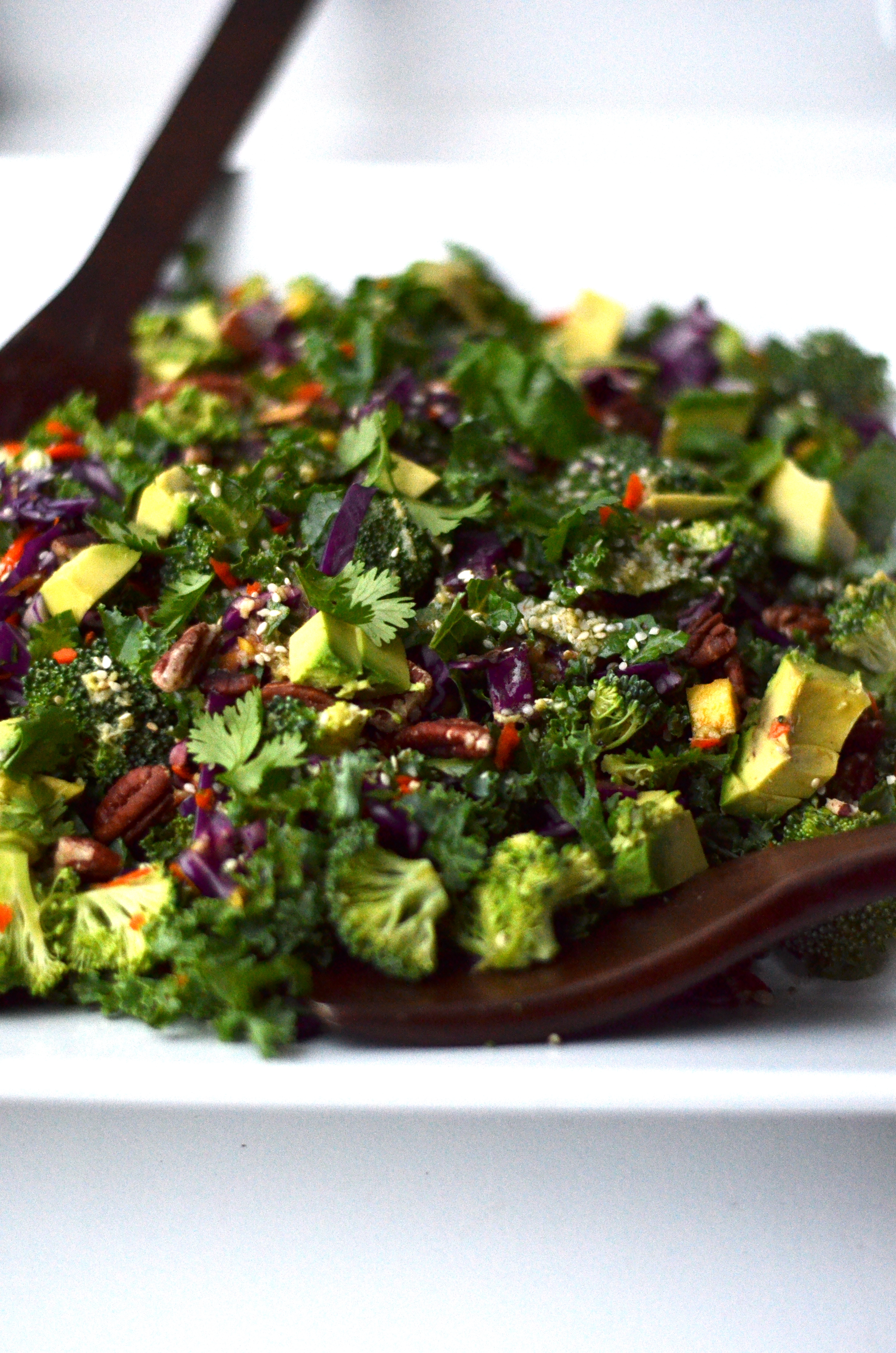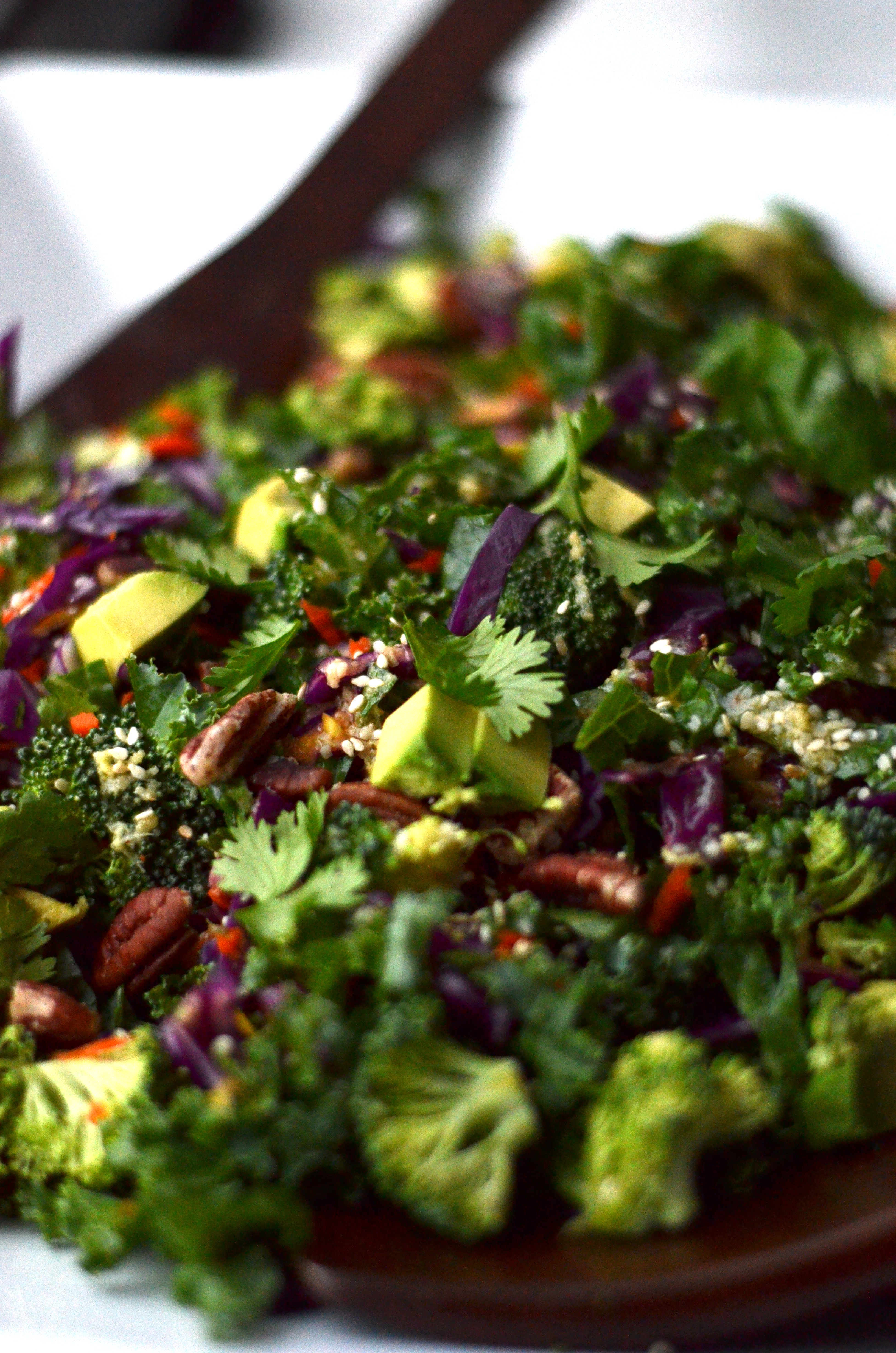 Thinly slice and dice up all your veggies. Toss everything together and make dressing by combining all ingredients listed. Whisk lightly and then pour over salad. Top with a sprinkling of sesame seeds or hemp seeds!