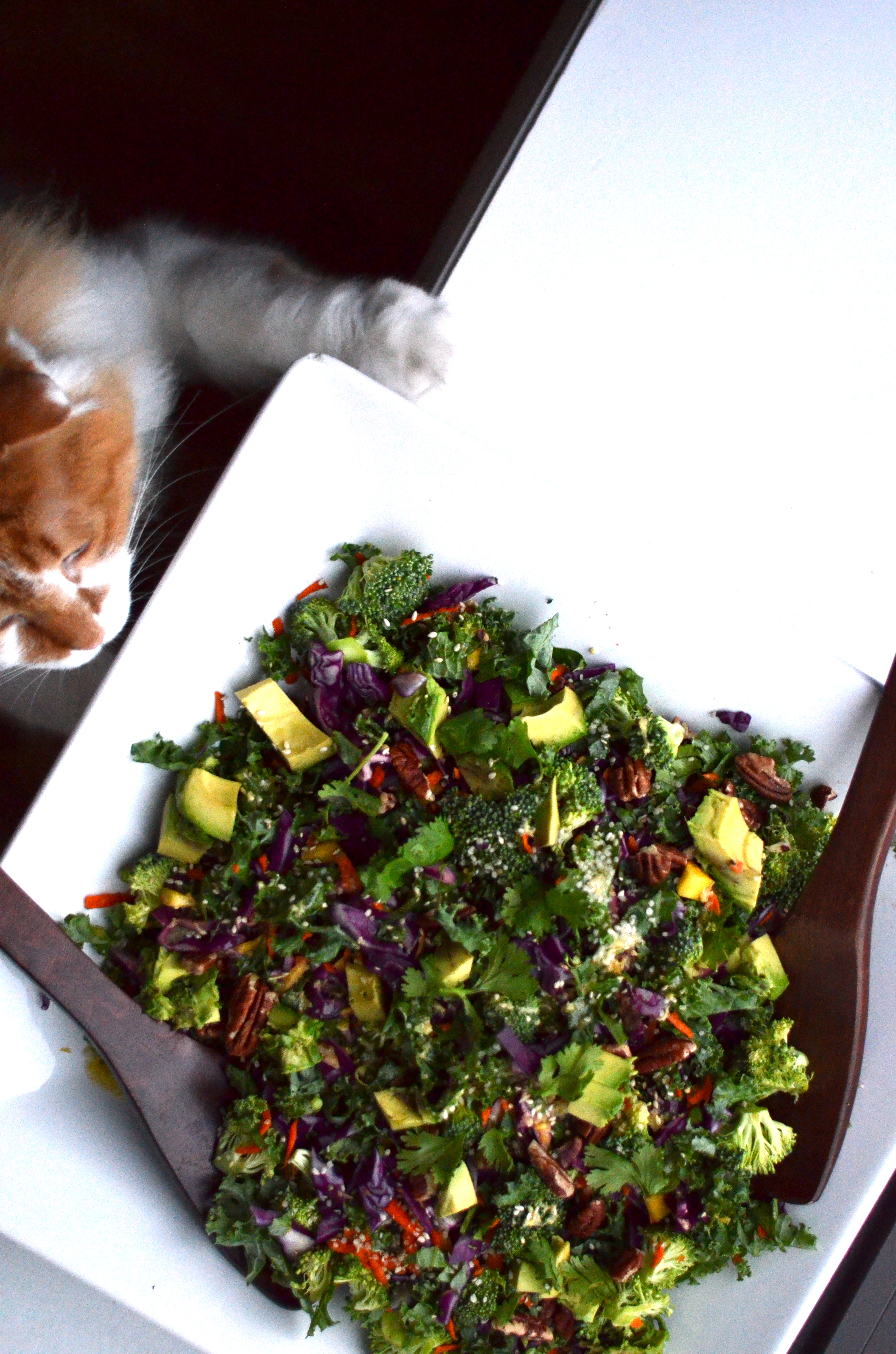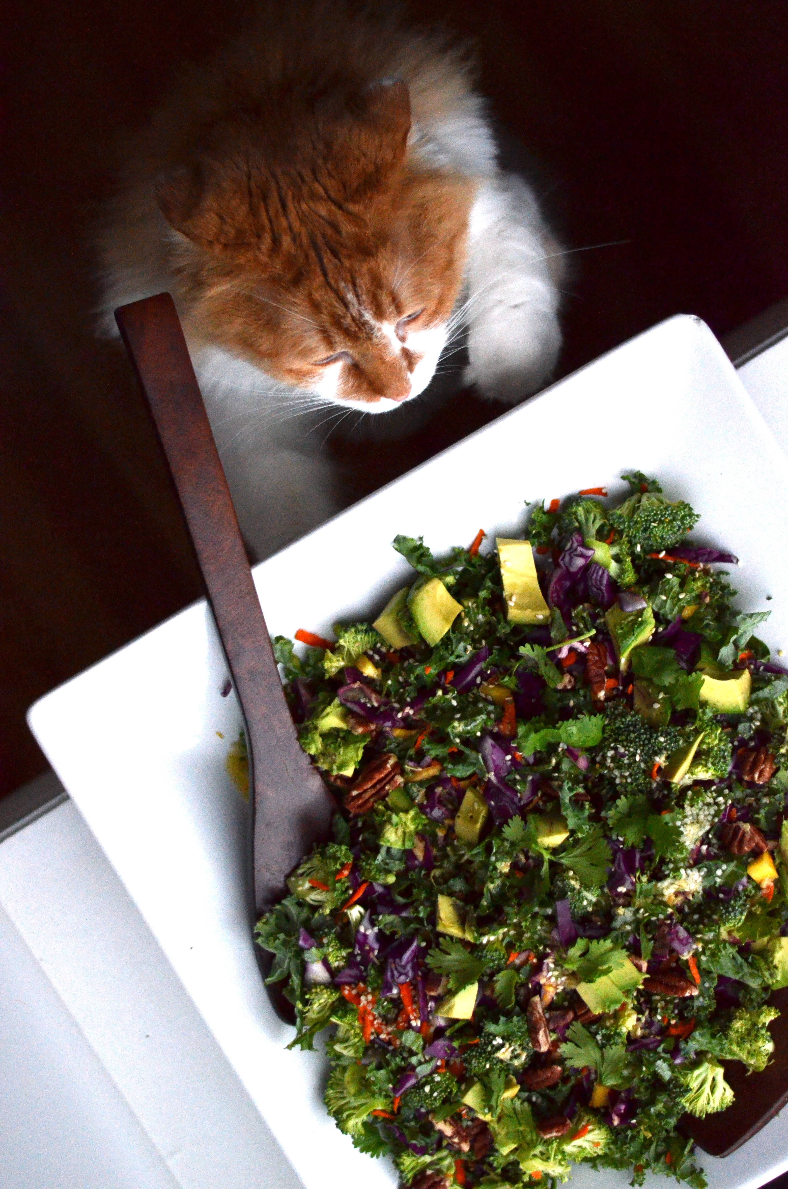Check out Norman in the picture below (and also at the very bottom). He is ALWAYS trying to photo bomb my pictures. I typically stand on a chair/couch/table on one foot using the other foot to try and block him from deep-diving into my food. I literally don’t know how else to teach a cat to stay off the table and counter. I yell, chase, spray, smack and make every single other sound and motion humanly possible to try and scare him and he just stares at me like I’m a crazy person (he’s not wrong).