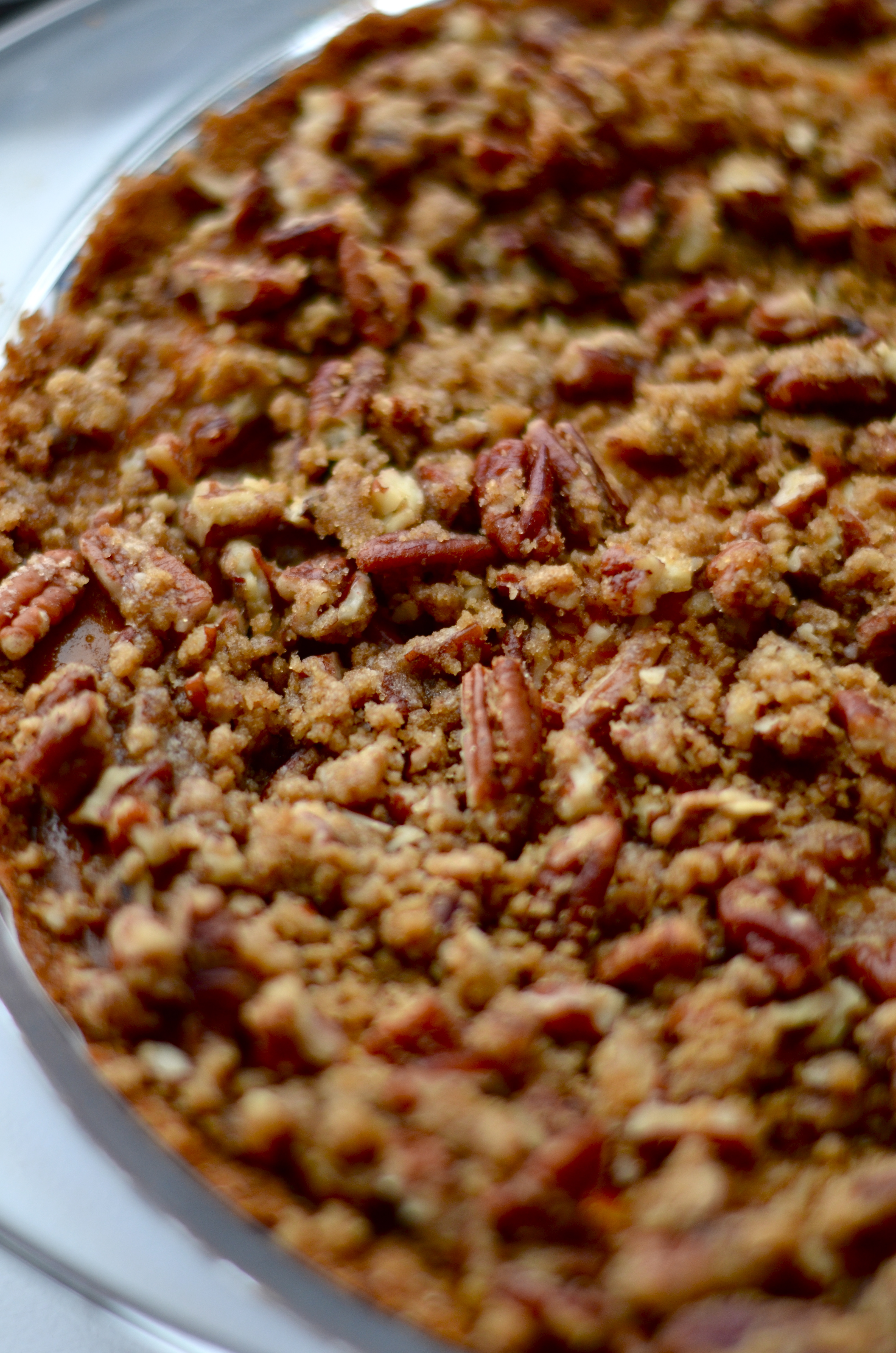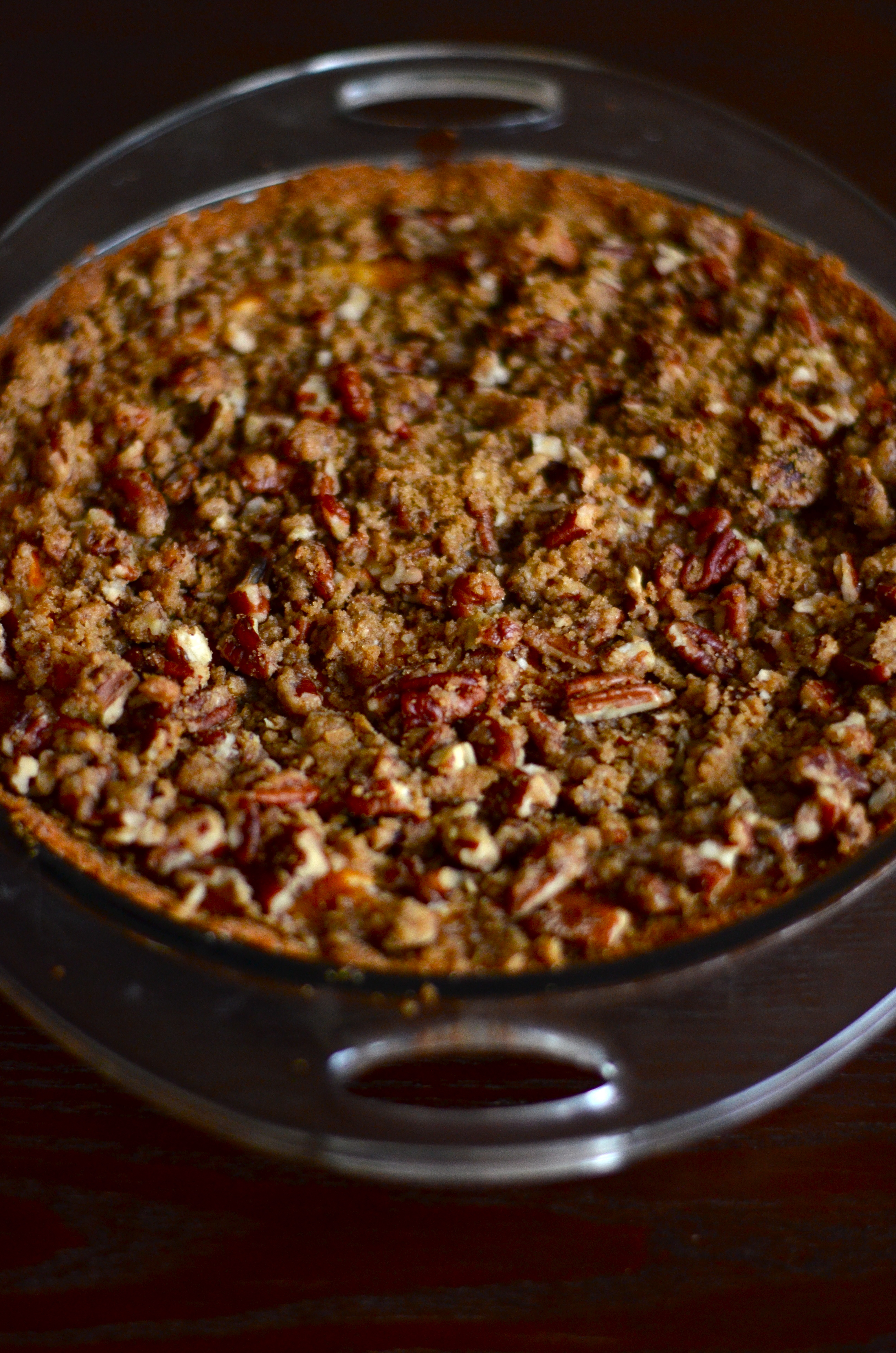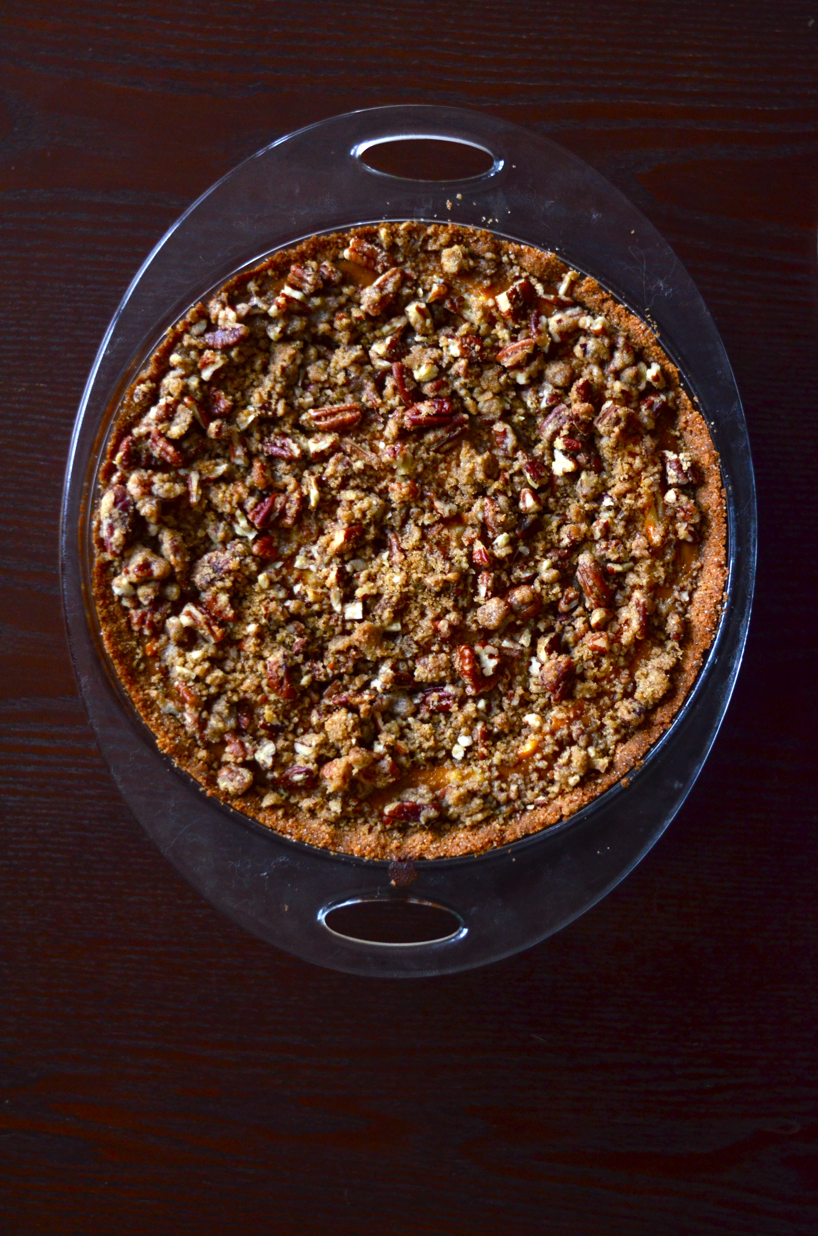 It’s a mixture of graham crust, a layer of cheesecake, a layer of pumpkin pie and then topped with a cinnamon and pecan streusel. Basically all your favorite things!